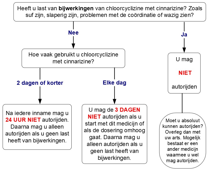 • Gebruikt u cinnarizine met chloorcyclizine 2 dagen of korter? Dan mag u 24 uur niet autorijden na iedere inname. Daarna mag u alleen autorijden als u geen last heeft van bijwerkingen.
