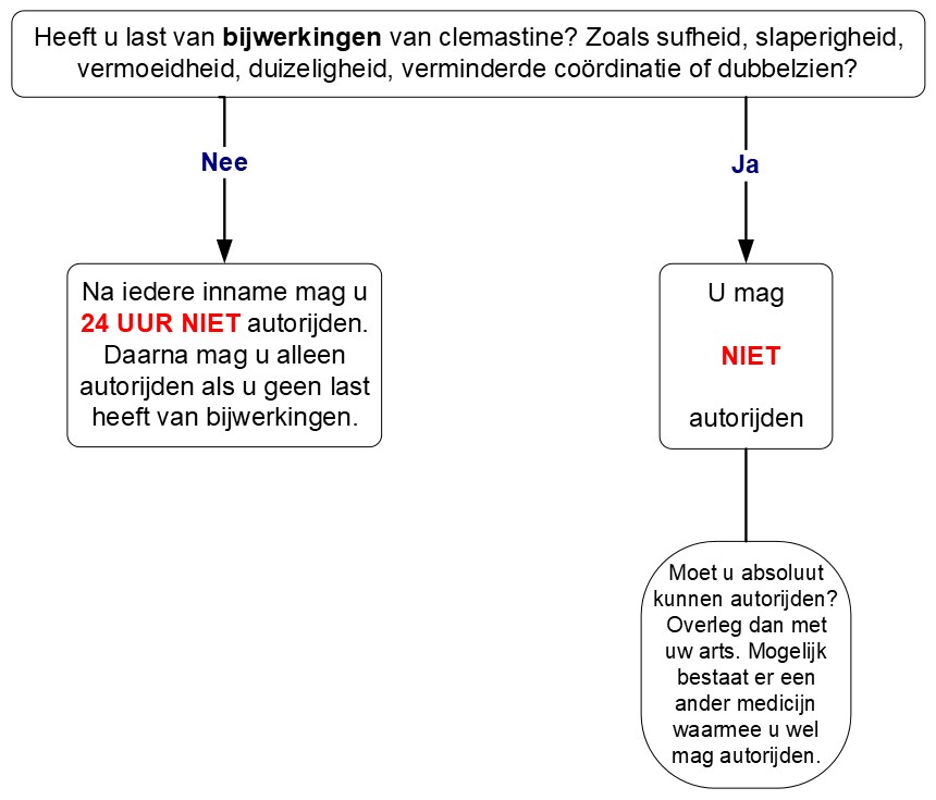 Het kan gevaarlijk zijn aan het verkeer deel te nemen als u dit medicijn gebruikt. Wilt u weten of u met dit medicijn mag autorijden? Beantwoord dan de vragen in het schema hieronder.